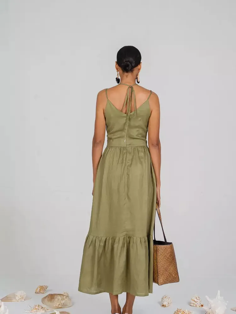 Dettagli del vestito di lino casual lungo con scollo a V profondo da donna